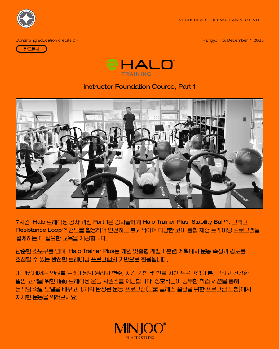 Merrithew¢ç Lead IT, Krisztian Melykuti ÀÇ °ø½Ä ÆÄ¿îµ¥ÀÌ¼Ç ±³À°ÀÌ ¹ÎÁÖÇʶóÅ×½º ÆÇ±³º»Á¡¿¡¼ ¿¸³´Ï´Ù!À̹ø ±³À°Àº ÇÏ·ç 7½Ã°£ ÁøÇàµÇ¸ç °»çºÐµéÀÌ ½ÇÀü¿¡ ¹Ù·Î Àû¿ëÇÒ ¼ö Àִ ƼĪ ½ºÅ³°ú ÇÁ·Î±×·¡¹Ö Àü·«À» ¹è¿ï ¼ö ÀÖ´Â ±âȸÀÔ´Ï´Ù..¦¡¦¡¦¡¦¡¦¡¦¡¦¡✔ Merrithew °ø½Ä ¼ö·áÁõ ¹ß±Þ¦¡¦¡¦¡¦¡¦¡¦¡¦¡📍 Àå¼Ò: ¹ÎÁÖÇʶóÅ×½º ÆÇ±³º»»ç📅 ÀÏÁ¤: 2025³â 12¿ù 7ÀÏ(ÀÏ)🎓 °»ç: Merrithew¢ç Lead IT, Krisztian Melykuti.¦¡¦¡¦¡¦¡¦¡¦¡¦¡🔸Halo¢ç Training Instructor Foundation Course, Part 12025³â 12¿ù 7ÀÏ(ÀÏ) 10:00~18:00 (0.7 CECs).7½Ã°£, Halo Æ®·¹ÀÌ´× °»ç °úÁ¤ Part 1Àº °»çµé¿¡°Ô Halo Trainer Plus, Stability Ball¢â, ±×¸®°í Resistance Loop¢â ¹êµå¸¦ Ȱ¿ëÇÏ¿© ¾ÈÀüÇϰí È¿°úÀûÀÌ¸ç ´Ù¾çÇÑ ÄÚ¾î ÅëÇÕ Ã¼Áß Æ®·¹ÀÌ´× ÇÁ·Î±×·¥À» ¼³°èÇÏ´Â µ¥ ÇÊ¿äÇÑ ±³À°À» Á¦°øÇÕ´Ï´Ù. ´Ü¼øÇÑ ¼Òµµ±¸¸¦ ³Ñ¾î, Halo Trainer Plus´Â °³ÀÎ ¸ÂÃãÇü ·¹º§ 1 ÈÆ·Ã °èȹ¿¡¼ ¿îµ¿ ¼Ó¼º°ú °µµ¸¦ Á¶Á¤ÇÒ ¼ö ÀÖ´Â ¿ÏÀüÇÑ Æ®·¹ÀÌ´× ÇÁ·Î±×·¥ÀÇ ±â¹ÝÀ¸·Î Ȱ¿ëµË´Ï´Ù..ÀÌ °úÁ¤¿¡¼´Â ÀÎÅ͹ú Æ®·¹ÀÌ´×ÀÇ ¿ø¸®¿Í º¯¼ö, ½Ã°£ ±â¹Ý ¹× ¹Ýº¹ ±â¹Ý ÇÁ·Î±×·¥ ÀÌ·Ð, ±×¸®°í °Ç°ÇÑ ÀÏ¹Ý °í°´À» À§ÇÑ Halo Æ®·¹ÀÌ´× ¿îµ¿ ½ÃÄö½º¸¦ Á¦°øÇÕ´Ï´Ù. »óÈ£ÀÛ¿ëÀÌ Ç³ºÎÇÑ ÇнÀ ¼¼¼ÇÀ» ÅëÇØ ¿òÁ÷ÀÓ ¼÷´Þ ¸ðµ¨À» ¹è¿ì°í, 8°³ÀÇ ¿Ï¼ºµÈ ¿îµ¿ ÇÁ·Î±×·¥(±×·ì Ŭ·¡½º ¼³Á¤À» À§ÇÑ ÇÁ·Î±×·¥ Æ÷ÇÔ)¿¡¼ ÀÚ¼¼ÇÑ ¿îµ¿À» ÀÍÇôº¸¼¼¿ä..¦¡¦¡¦¡¦¡¦¡¦¡¦¡.¢Ï️¹®ÀÇ📩½Åû ¹× ¹®ÀÇ: īī¿ÀÅå ä³Î (¹ÎÁÖÇʶóÅ×½º ±³À°ÆÀ)µî·Ï ¹× ÀÚ¼¼ÇÑ Á¤º¸: IG ÇÁ·ÎÇÊ @minjoopilates_education ¸µÅ©·Î À̵¿.Merrithew¢ç Hosting Training Center27 Unjung-Ro, Bundang-GuSungnam-Si, Republic of Korea..#¹ÎÁÖÇʶóÅ×½º ½ºÆ©µð¿À¹ÎÁÖÇʶóÅ×½º´Â 8°³ÀÇ Á÷¿µÁ¡À» ¿î¿µÁßÀ̸ç, 4°÷(ÆÇ±³, ¼Ûµµ, ¼¿ï, Á¦ÁÖ)¿¡¼ #½ºÅ¿ÇʶóÅ×½º ±¹Á¦±³À°À» ÁøÇàÇϰí ÀÖ½À´Ï´Ù. ÃÖ°íÀÇ ±³À°ÀÎÇÁ¶ó¸¦ ÀÚ¶ûÇÏ´Â ¹ÎÁÖÇʶóÅ×½º¿¡¼ ´ç½ÅÀÇ ¹Ì·¡¸¦ ¼³°èÇϼ¼¿ä.¦¡¦¡¦¡¦¡¦¡¦¡¦¡Where passion meets precision, Minjoo Pilates!Business Inquiry: education@minjoopilates.com¦¡¦¡¦¡¦¡¦¡¦¡¦¡
